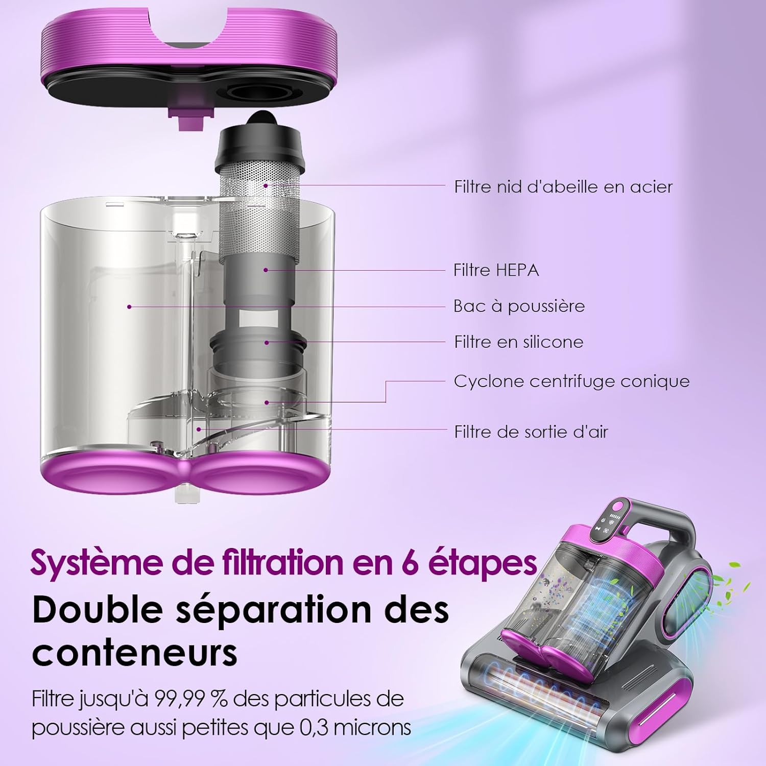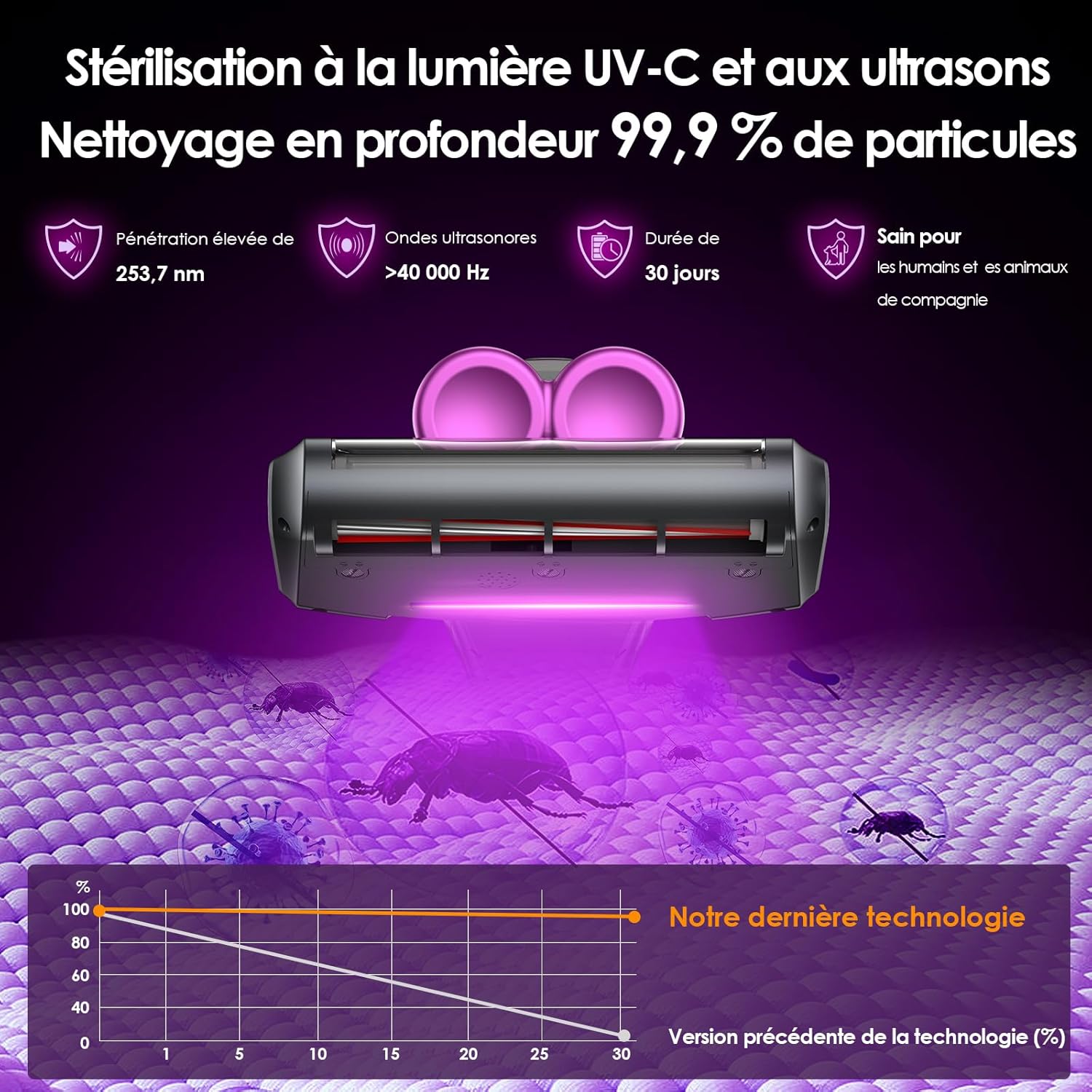 - Grâce à sa puissance d’aspiration de 18 000 Pa, combinée à un système de battement haute fréquence et à une lampe UV-C de 253,7 nm, il aide à retirer les particules incrustées dans les fibres textiles et contribue à limiter les allergènes présents dans votre environnement. Son filtre HEPA capture les particules fines pour éviter leur rejet dans l’air.